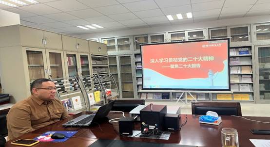 团省委青年讲师团成员、我院青年教师步洋洋副教授以《深入学习贯彻党的二十大精神-----聚焦二十大报告》为题,从二十大报告主要内容,全面依法治国、推进法治中国建设,坚定不移全面从严治党,青年兴则国家兴等四个方面分享了学习党的二十大精神的心得体会。