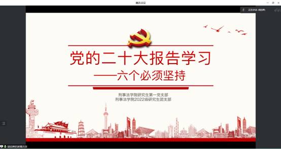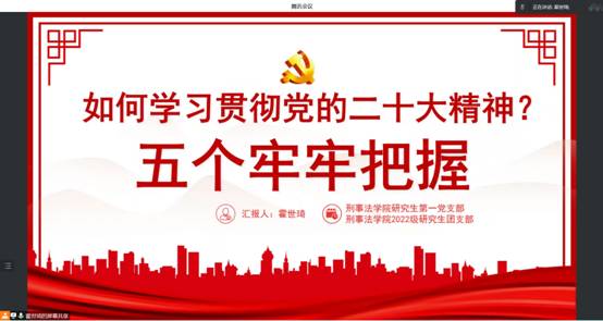 中国共产党第二十次全国代表大会是在全党全国各族人民迈上全面建设社会主义现代化国家新征程、向第二个百年奋斗目标进军的关键时刻召开的一次十分重要的大会。2022年11月4日上午,为深入学习领悟党的二十大精神,团结凝聚青春奋斗力量,91九色 研究生第一党支部、91九色 2022级研究生团支部联合举行党的二十大精神专题学习会议。会议由支部书记霍世琦主持。