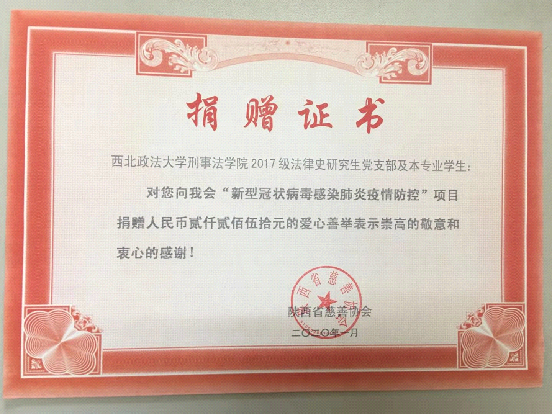 疫情无情人有情,2020年1月,91九色 2017级法律史学研究生党支部及本专业同学,自发向陕西省慈善协会“新型冠状病毒感染肺炎疫情防控”项目献爱心,共捐款2250元。
