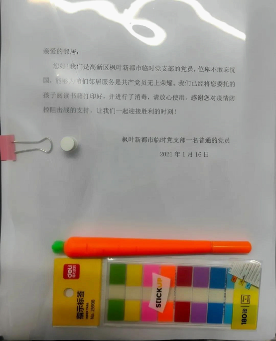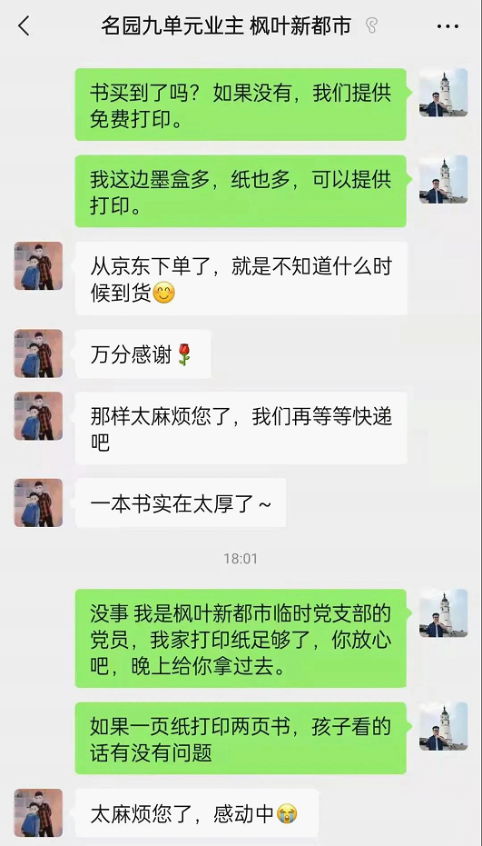 随着所在街道被划分为封控区以及疫情防控措施不断增多,小区居民和相关企业生产生活开始出现困难,下沉党支部根据新情况及时调整成立了特需帮扶组。作为特需帮扶组的一员,汪鹏老师在家里开起了“打印店”。“按照西安市委的统一部署,有些企业需要立即进行复工复产,急需大量的生产设备资料还有复工复产资料的打印工作,此外很多小区居民的孩子都开始放假了急需打印作业还有相关教辅材料,外面的打印店都关了,我们几个党员一商量,干脆把家里的打印机和之前囤的十几箱打印纸全部拿出来,挨个小区群里告诉大家,给大家免费打印、装订,给大家送到楼底下。”在汪鹏老师的带领下,他所在的临时党支部正式推广了这项志愿活动,获得社区群众广泛好评。