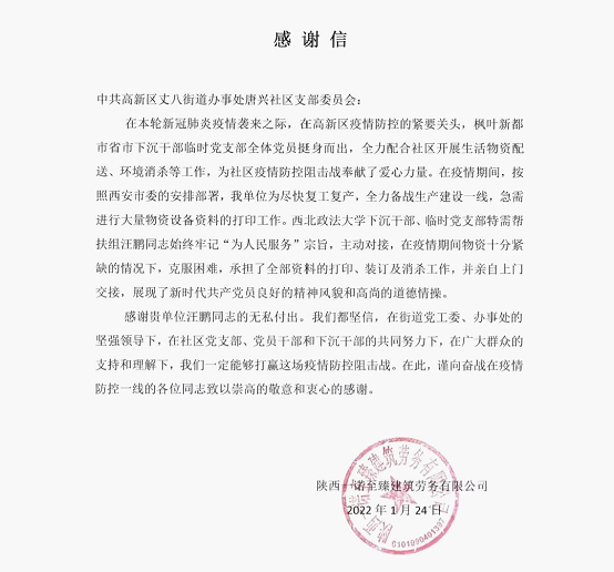 基层是疫情联防联控的第一线,也是外防输入、内防扩散的关键防线。面对所在小区防疫力量紧缺的境况,汪鹏老师同其他省、市下沉干部同志一道,按照高新区委组织部的安排,成立了小区临时党支部,在社区敲门访户、核酸检测、秩序维持、物资搬运、巡逻值岗、特需帮扶等每一个防疫闭环里挥洒汗水。以“我在阵地在”的责任感、使命感,咬紧牙关,分秒必争,哪里需要就在哪里,哪里紧迫就冲向哪里,将“我为群众办实事”的具体实践牢牢深入到社区抗疫一线。