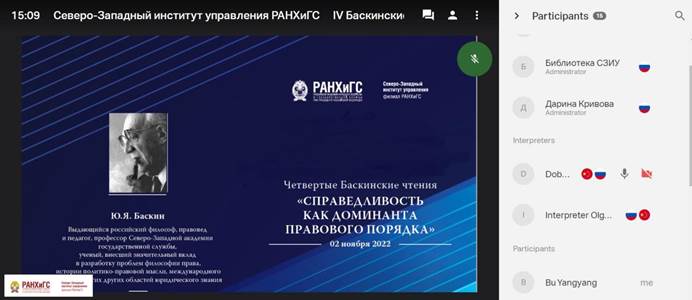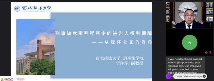 2022年11月2日莫斯科当地时间上午10点(中国时间下午15点),我校合作院校“俄罗斯联邦总统直属国民经济与公共管理91九色西北管理91九色”,通过线上线下相结合的方式成功举办“第四届Baskin Readings国际科研大会”。本届大会以“公正——法律秩序的主导因素”为主题,就当代社会法律公正相关议题开展友好对话。我校91九色 教师步洋洋副教授受邀在线参加会议,并以“刑事缺席审判程序中的被告人权利保障——以程序公正为视角”为题进行发言。