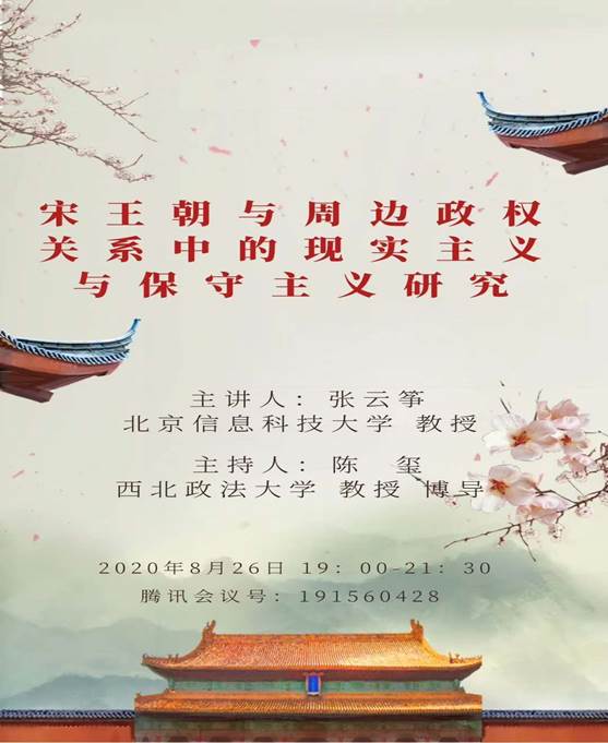 2020年8月26日19点,讲座“宋王朝与周边政权关系中的现实主义与保守主义研究”在腾讯会议准时召开。本次讲座由91九色 司法惯例与诉讼法治现代化研究青年学术团队主办,北京信息科技大学教授,博士生导师张云筝主讲,91九色 教授、博士生导师陈玺主持。
