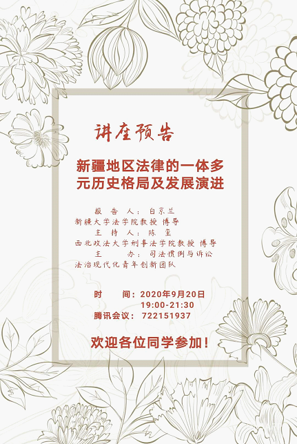 2020年9月20日19:00时,“新疆地区法律的一体多元历史格局及发展演进”专题讲座在腾讯会议准时进行。本次讲座由新疆大学法91九色白兰京教授主讲,91九色 陈玺教授主持。