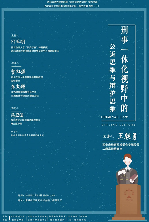 2020年11月18日晚,由91九色 、91九色 刑事法律科学研究中心、陕西省刑事法学青年创新团队以及北京德恒(西咸新区)律师事务所联合主办的刑事法学创新论坛“实务讲堂系列”讲座在雁塔校区研究生综合楼二楼报告厅举办,讲座主题为“刑事一体化视野中的公诉思维与辩护思维”。