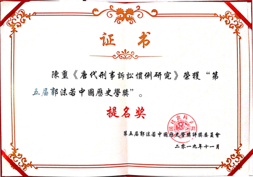 11月20日,第五届郭沫若中国历史学奖颁奖仪式在北京人民大会堂隆重举行,我院陈玺教授专著《唐代刑事诉讼惯例研究》获提名奖。