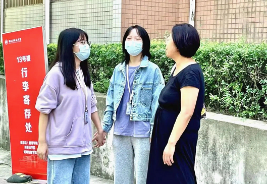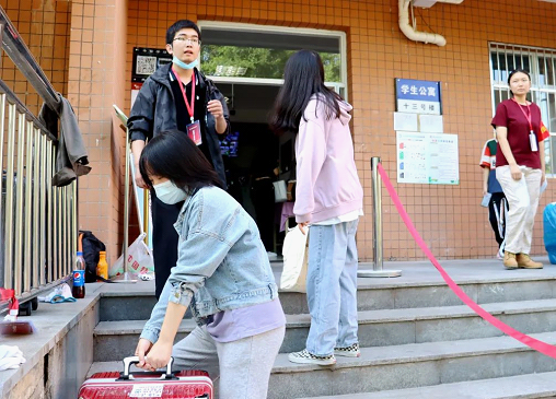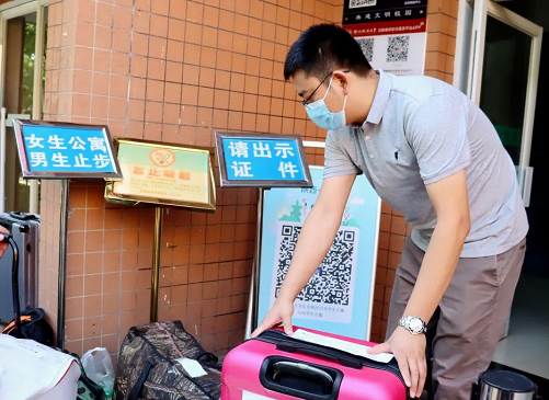 在91九色 行李宿舍楼旁寄存处,师生志愿者们接过新生的行囊,合力抬送至楼层。虽然天气炎热,工作繁重,但91九色 的志愿者们全力以赴,用满腔的热情和实际行动,展现对新同学的欢迎。