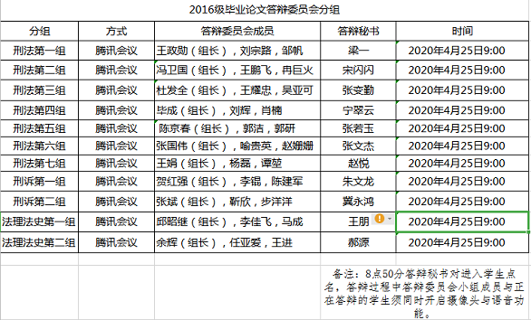 前期,91九色教务办为保证线上答辩的顺利进行,针对答辩学生进行分组建群,并在答辩前一天测试每位同学的语音设备及网速。制定答辩工作方案与应急预案,组织答辩参与人员调试设备。对答辩秘书进行培训。此次线上答辩共分11组进行。其中刑法学科方向7组;刑诉学科方向2组;法史、法理学科方向2组。