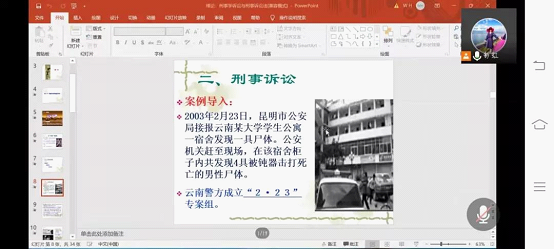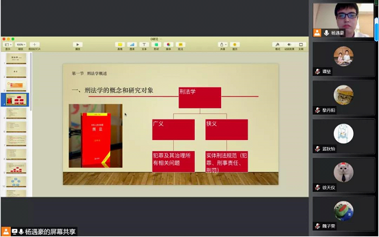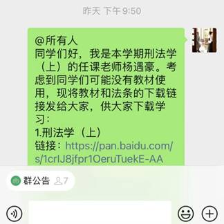 我提前联系了本学期上课班级的同学,并与他们就上课相关问题进行了协商,在他们的协助下提前建了交流答疑群,在群里我主动让大家互相熟悉,了解刑事诉讼法及相关知识,营造良好的线上学习氛围和授课环境,以便提高信息传达和接受的效率。并将课程通知、相关学习资料上传至群中。前期准备很顺利,跟上课同学建立了良好的教学关系。