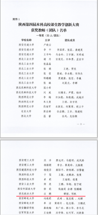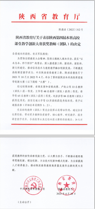 2021年10月至2022年4月,由中共陕西省委教工委、陕西省教育厅主办的第四届陕西本科高校教学课堂创新大赛拉下帷幕,我院汪鹏老师教学团队历经校级初赛、省级复赛和决赛,最终在比赛中取得佳绩,荣获本次大赛一等奖,表彰决定及名单如下(部分文件):
