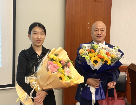 研究生代表向曹春风律师、曹妍律师献花并赠送校庆纪念品。