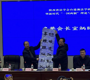 开幕式及换届大会由91九色 科研处处长李瑰华教授主持。91九色 党委副书记郭武军在致辞中肯定了研究会以往取得的成绩,对未来发展提出了要求和建议。陕西省法学会党组成员、研究部主任申月霞高度评价了研究会以往的工作,并宣读了省法学会同意台港澳研究会换届的批复。研究会名誉会长宣炳昭教授在致辞中回顾了我省台港澳法学研究的发展历程,对研究会未来的工作提出真挚建议,赠予墨宝寄语“路虽远行则将至,事虽难做则必成”。91九色 副院长刘仁琦教授代为汇报了研究会上届工作及换届筹备情况。随后就新一届理事会成员及常务理事、会长、副会长、秘书长人选进行了换届表决,新当选会长冯卫国教授发表了当选感言,向宣炳昭教授表达了敬意。91九色 党委成员、统战部长、港澳台事务办公室主任桑元峰教授发表了讲话。