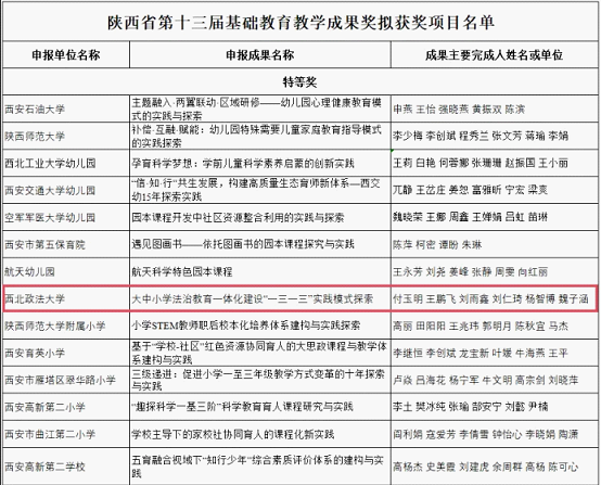 根据《陕西省教育厅、陕西省人力资源和社会保障厅关于公布陕西省基础教育、中等职业教育教学成果奖评审结果的通知》(陕教函〔2024〕1058号),经各市教育行政部门,各高等、中等职业学校和相关单位推荐,经形式审查、评前公示、网络评审、会议评审、厅务会审议、结果公示等程序,我院付玉明教授申报的“大中小学法治教育一体化建设“一三一三”实践模式探索”项目,荣获陕西省基础教育教学成果特等奖。