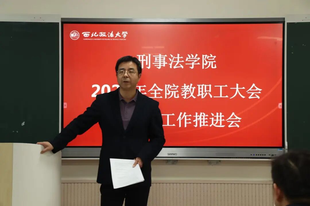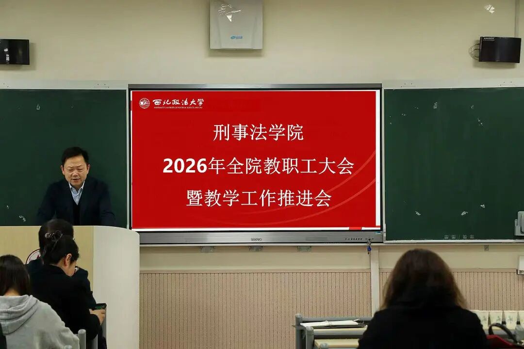 陈京春院长全面总结学院2025年各项工作,系统梳理学科建设、教学科研、人才培养、学生管理及社会服务等方面的扎实成效,客观分析当前发展面临的形势与短板,并对2026年重点工作作出统筹部署。他强调,全体教职工要坚守法学教育初心,聚焦主责主业,强化使命担当,持续夯实教学基础、提升科研水平、优化学科建设,以实干作风推动学院各项事业稳步提质、再创佳绩。孙学龙书记在总结讲话中指出,本次会议既是年度工作部署会,也是凝心聚力的动员会。全体教职工要提高政治站位,坚守立德树人根本任务,把思想和行动统一到学院发展部署上来,不断强化责任意识、协作意识与落实意识,立足刑事法学学科优势,深耕教学科研一线,抓实抓细人才培养各项工作,以更加饱满的精神状态和务实的工作举措,奋力推动学院办学治院水平再上新台阶,努力为新时代法治人才培养和法治事业高质量发展作出更大贡献。