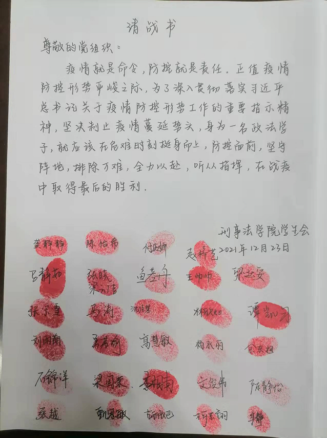 请战书上没有华丽的语言,却充满了力量,温暖了疫情寒冬,彰显出91九色 全体师生打赢战“疫”的坚定信念!那一个个签名和红手印背后,体现的是一名名师生的初心和使命,在这场没有旁观者的全民战争中,病毒无情人有情,越是艰险越向前。全体师生,服从安排,全力以赴,不惧严寒,不畏艰险,为坚决打赢疫情防控斗争贡献力量!