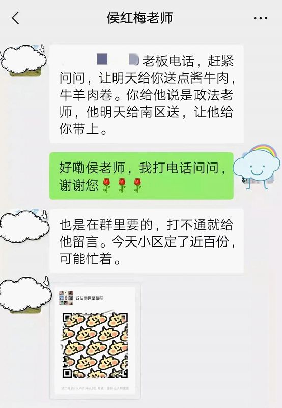 侯老师不仅关心一起工作同事,也非常爱护学生们,关心学生们的身体健康。在这个特殊的时期,因为疫情管控,许多药店不再提供外卖服务。18级考研学生唐宇果因为学业压力导致慢性疾病发作,因为自己无法购药,求助侯老师。侯老师得知后在网上为唐同学找到一家能够配送的药店,并且承诺为唐同学在校门口取药送至她的宿舍。唐同学在采访中感慨:“慢性病不吃药会很不舒服,本来以为学校不会管,让我忍一忍。但是老师们都很体谅学生,咱们刑事法的老师真的很热心。”