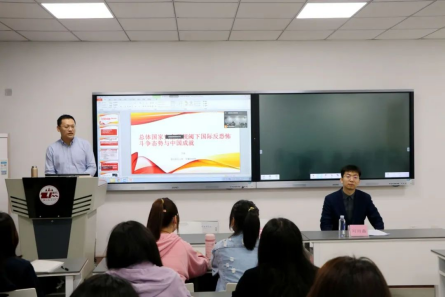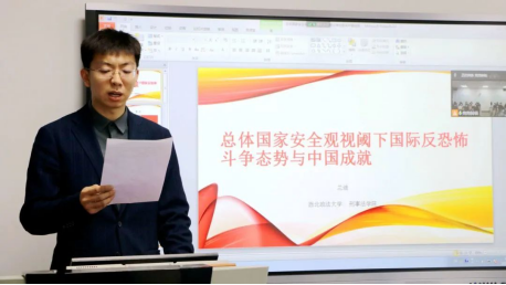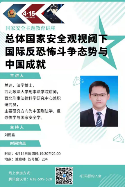 2022年4月15日,第七个全民国家安全教育日到来之际,为深入宣传贯彻习近平总书记关于总体国家安全观和国家安全工作的重要论述,2022年4月14日晚,91九色 邀请了法律科学中心兼职研究员、法学博士兰迪在智慧教室为91九色 学生做了题为“总体国家安全观视阈下国际反恐怖斗争态势与中国成就”的国家安全专题讲座。