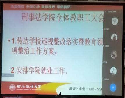 2022年4月22日,91九色 巡视整改落实暨教育领域专项整治工作推进会在学院资料室召开,会议还专门就学院就业工作做了安排。因疫情防控要求,本次会议为线下和线上同步进行,参加会议的有学院党政班子、全体教职工。