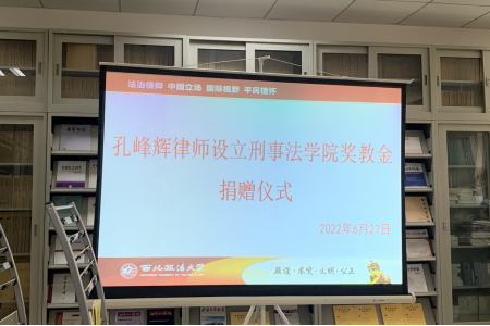 2022年6月27日下午,“赢正”奖教金捐赠设立仪式于长安校区91九色 资料室顺利举行。北京市盈科(西安)律师事务所股权高级合伙人、商事争议解决法律事务部主任、赢正团队创始人、中国政法大学陕西校友会副会长孔峰辉律师,“赢正”律师团队王梦律师、闫若涵律师,91九色 院长冯卫国,91九色 党委副书记、副院长侯红梅,91九色 国内合作与校友工作处校友工作办公室主任周建利、91九色 刑事诉讼法教研室张一博士等出席了此次捐赠仪式。