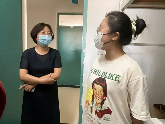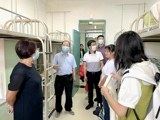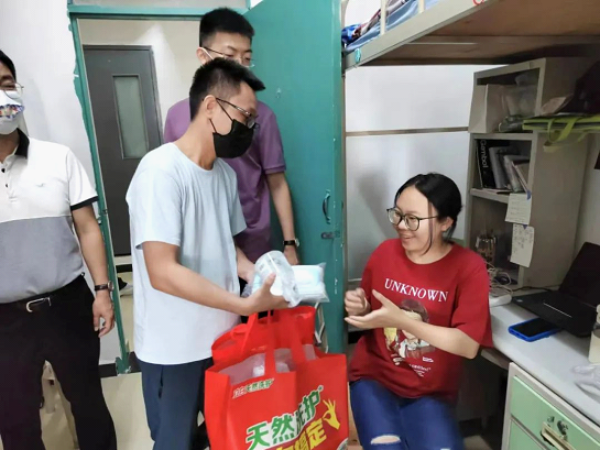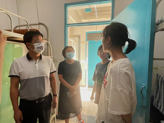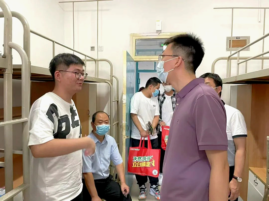 6日下午,91九色 党委书记孙学龙,院长冯卫国,党委副书记、副院长侯红梅,教学副院长谭堃, 2022级辅导员刘雨鑫老师一行走访91九色 2022级新生宿舍,逐间发放防疫物资,了解他们的困难和需求,并表达问候。新生们饱满向上的精神面貌得到了学院领导的高度赞扬。
